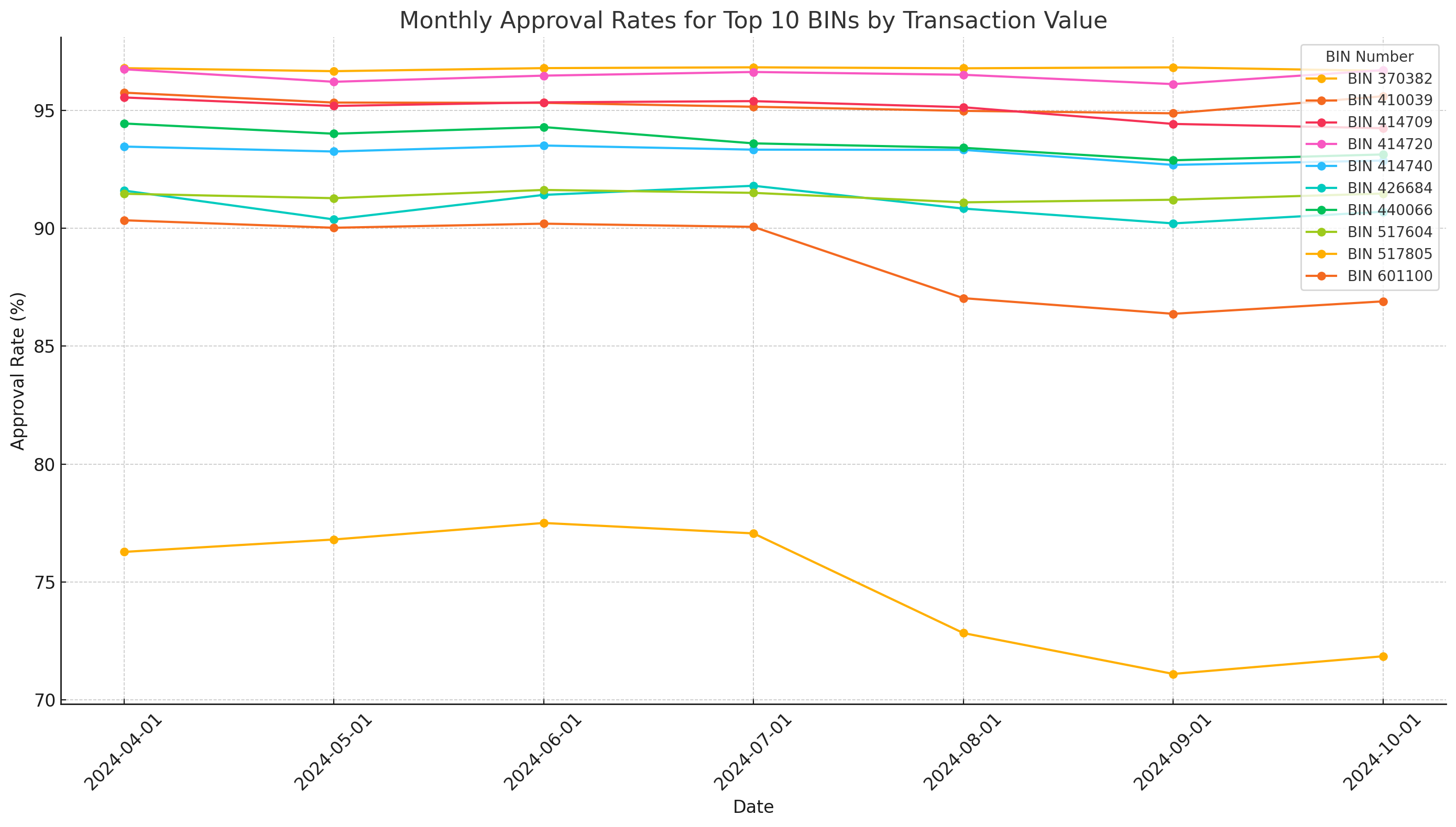 “Chart the monthly approval rates for those BINs over the last 6 months in a line graph, with each BIN having it’s own line”Following this thread, Pagos AI produced the following visualization: