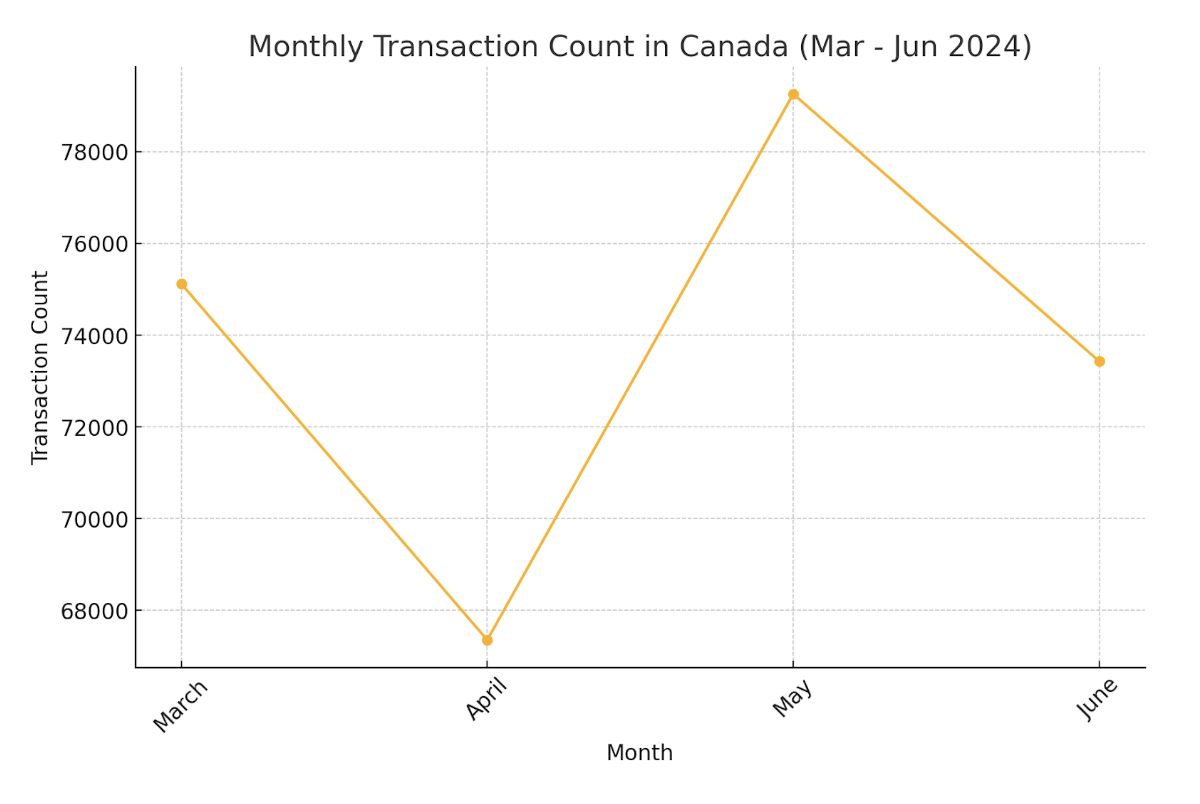 “Show me the monthly transaction count in Canada from March 1 to June 30, 2024?”For this example, we’ve included the following elements: