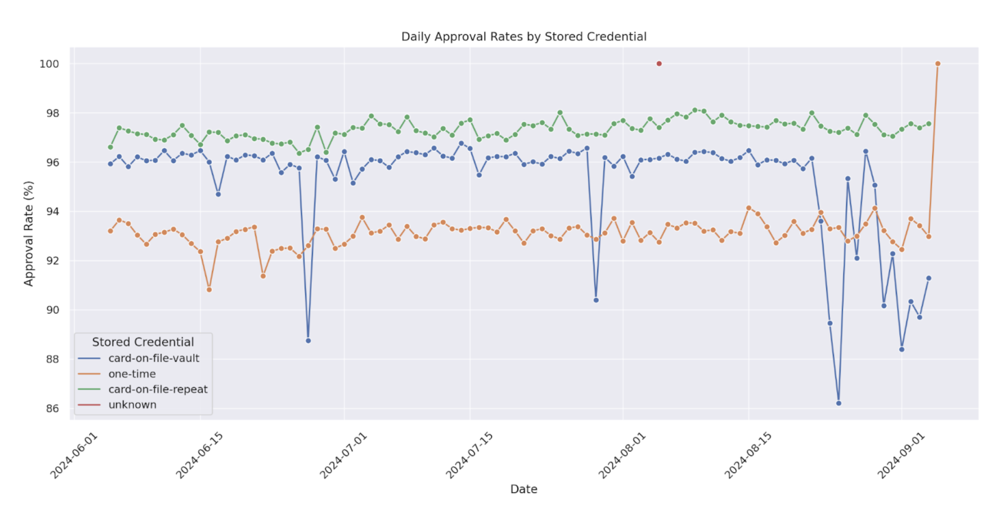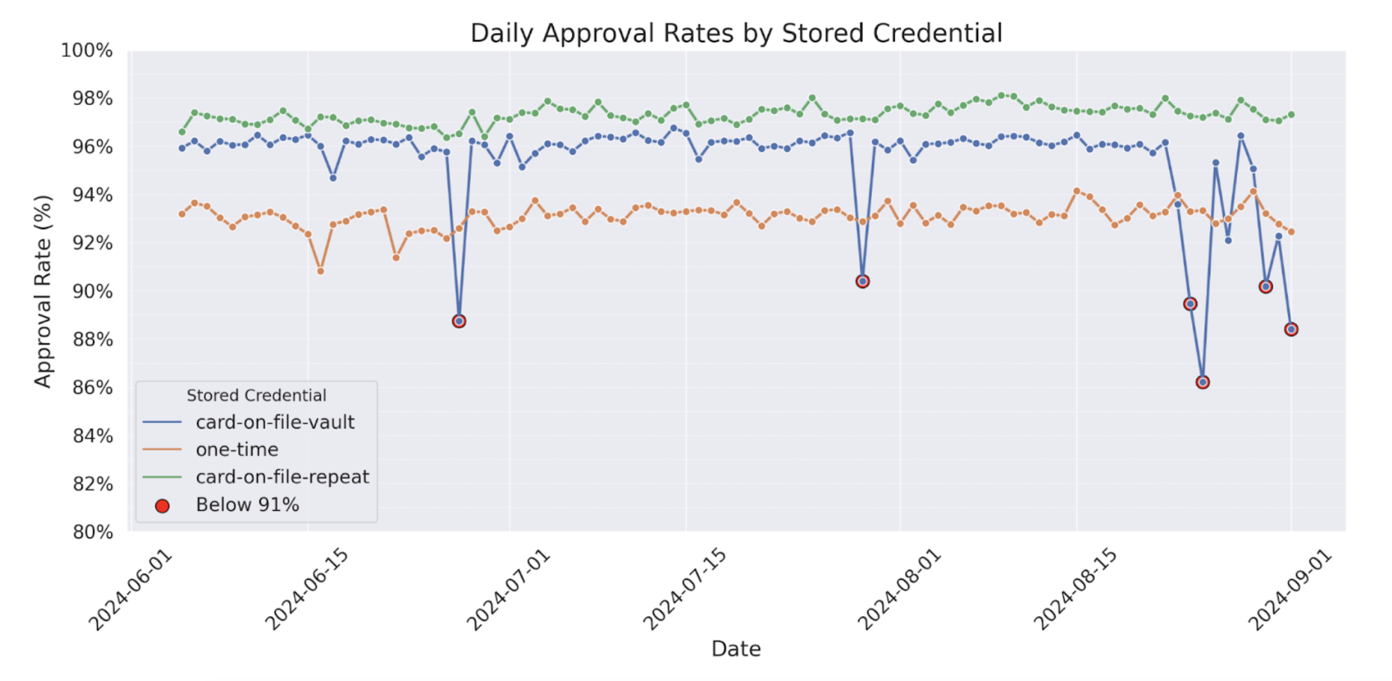 Prompt B: “Replot this up to September 1st, and remove the “unknown” category from the chart. Fix the y-axis between 80% and 100% with subticks for every percentile, but only label the even values. Make the x- and y-axis labels and the tick labels use a larger font, and ensure that the title font is 3 points larger than that. Use a linewidth of 2 units, but the same size marker. Add large open red circles around the values for card on file that fall below 91%.”Response: