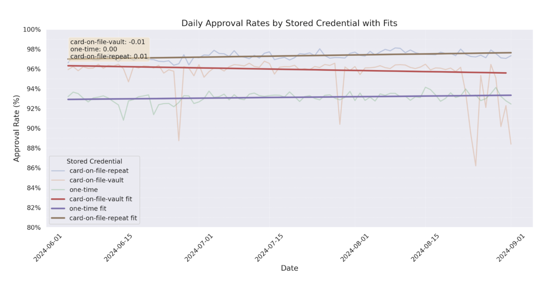 - Card-on-file-vault: The approval rate is decreasing at a rate of approximately -0.573 percentage points per month.